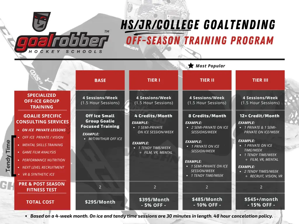 Cancellation Policy:Goalies will be charged for the full month of services selected. On ice cancellations must be communicated at least 48 hour prior to ice for potential rescheduling without charge.