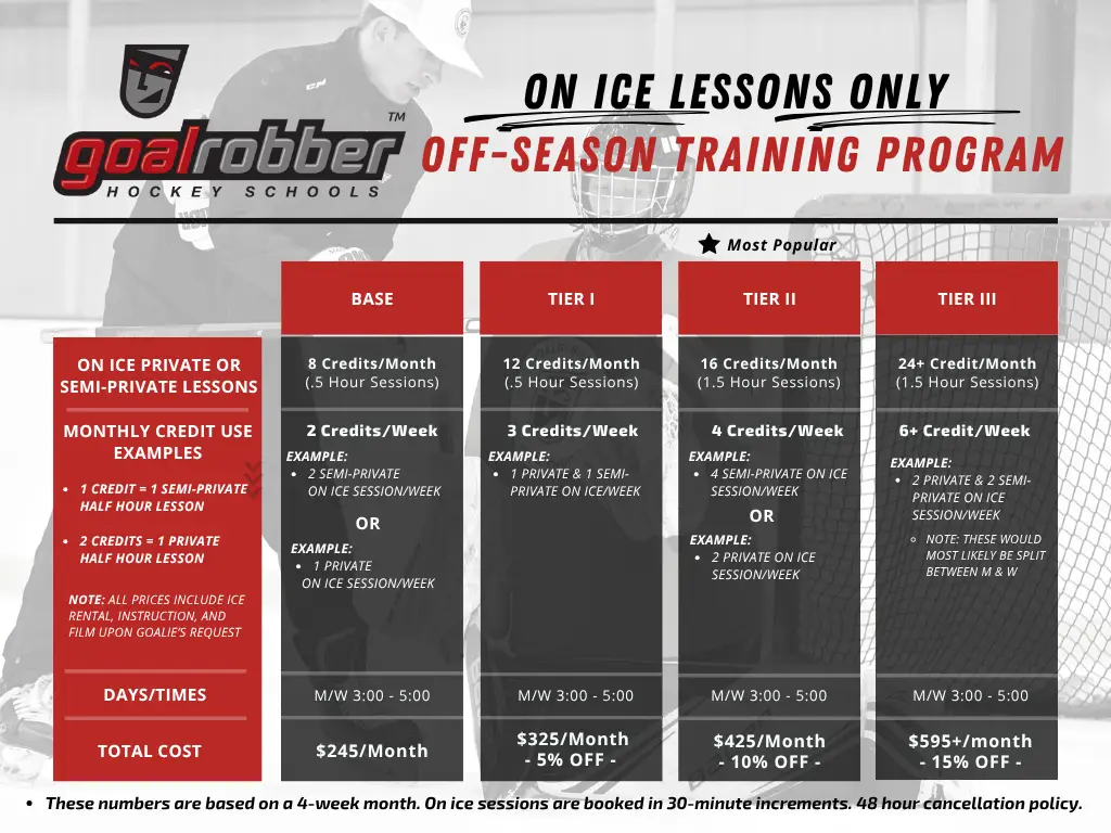 Program Customization: If goalies desire to build programs that include more off and/or on ice instruction than the plans above, reach out to build a custom program!