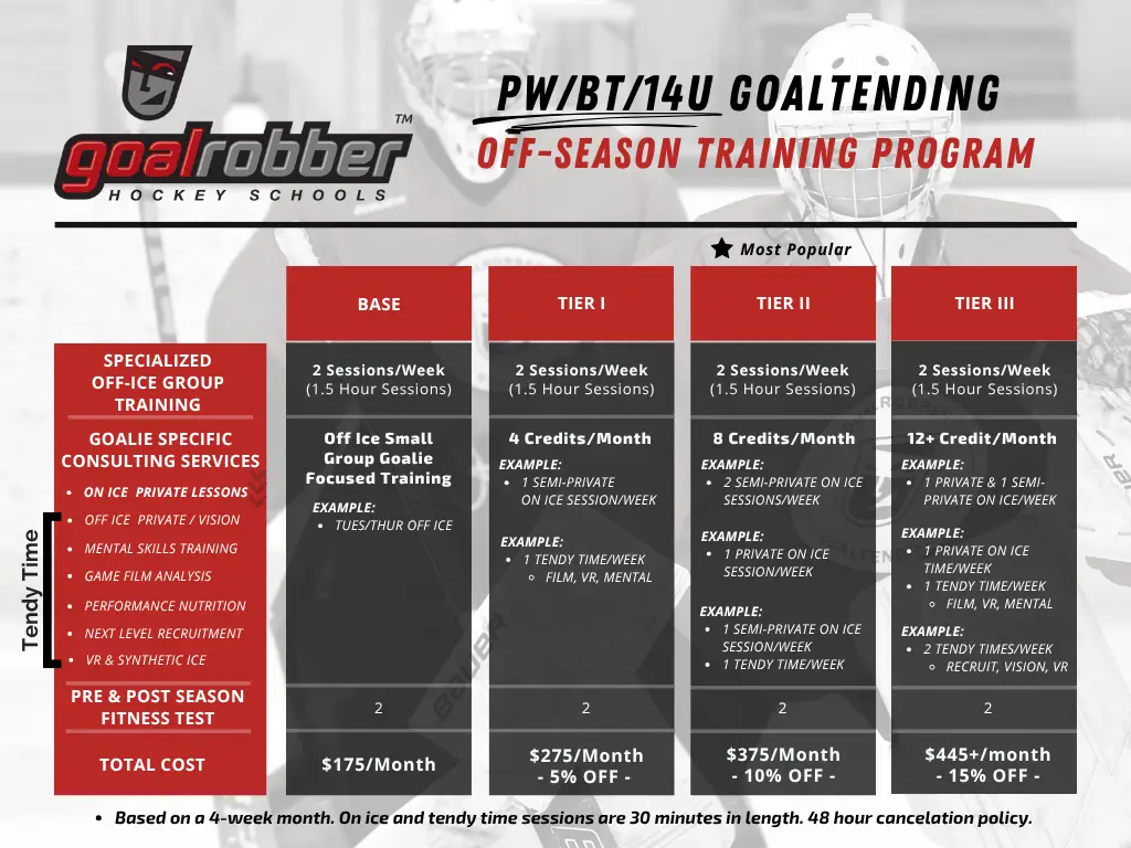 Note: Email info@goalrobber.com to sign up for one of the PW/BT/14U program tiers and to schedule your goaltender’s weekly ice! * see more action items below for more specifics