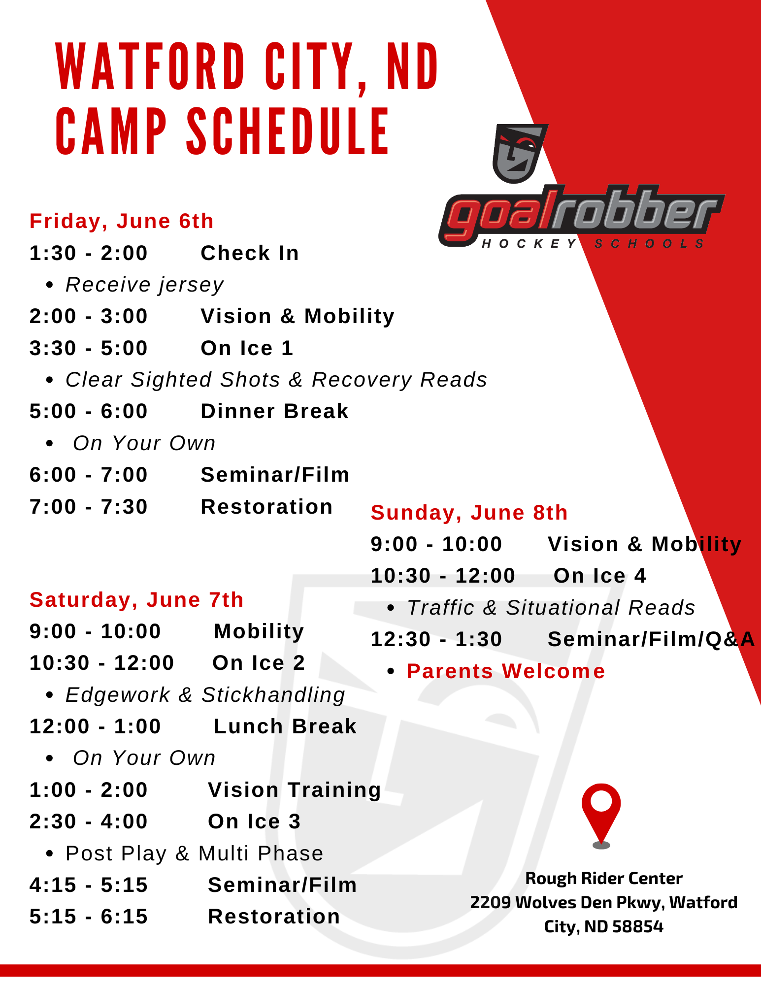 * Includes 12+ hours of goalie-specific instruction, jersey, & camp learning resources.
